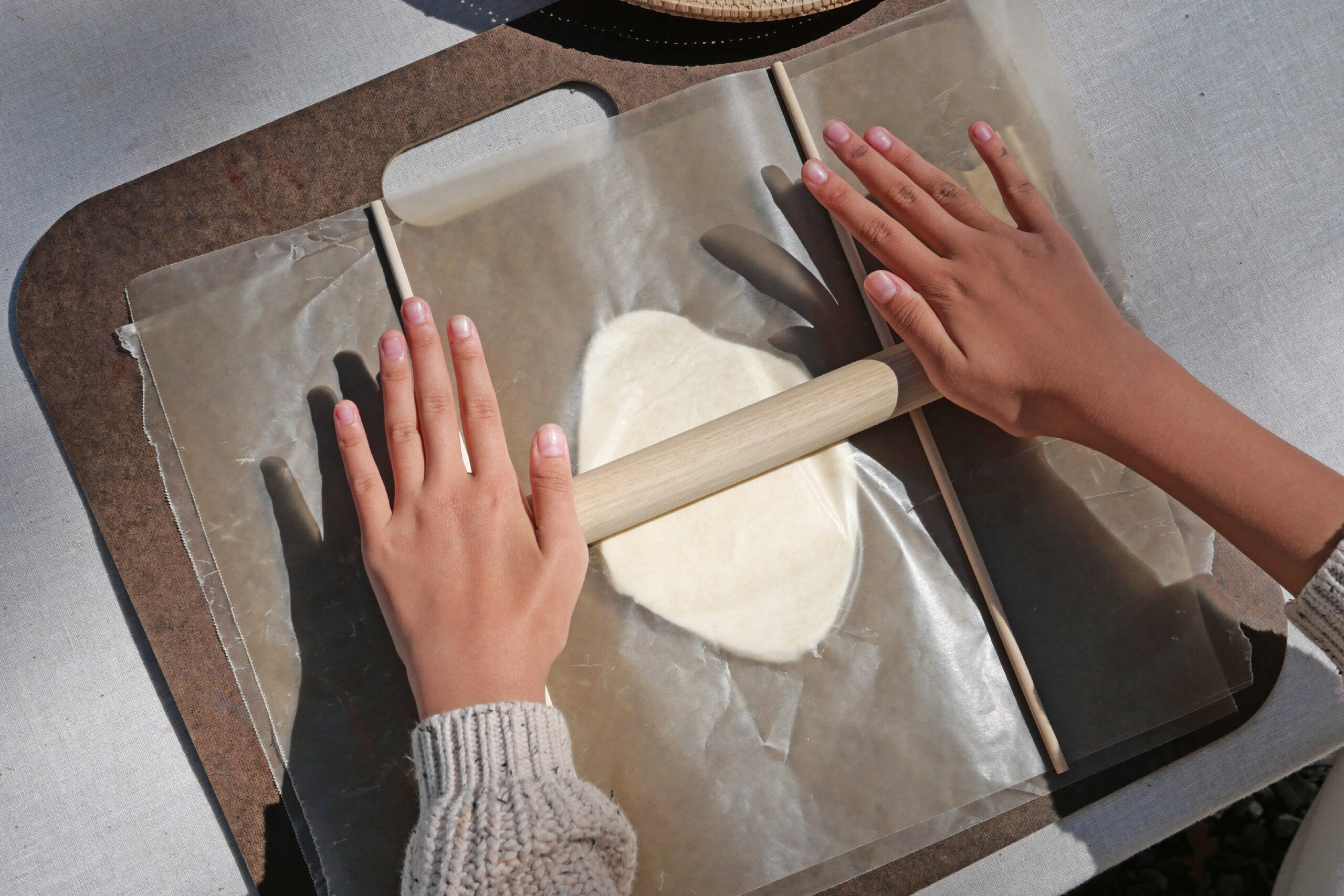 *私たちは粘土を5mmの均一な厚さに伸ばすために、5mmの棒2本を粘土の両サイドに置きました。