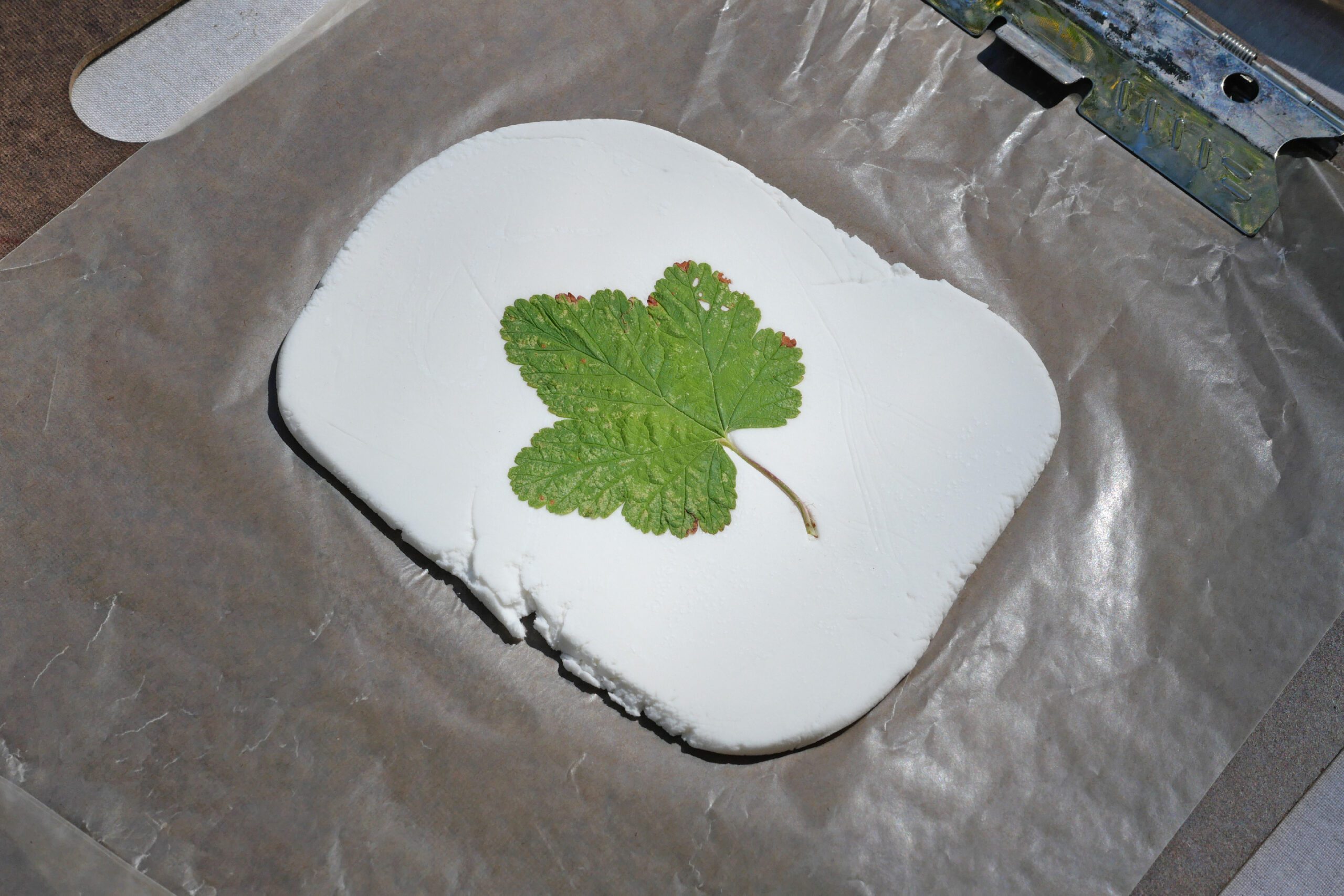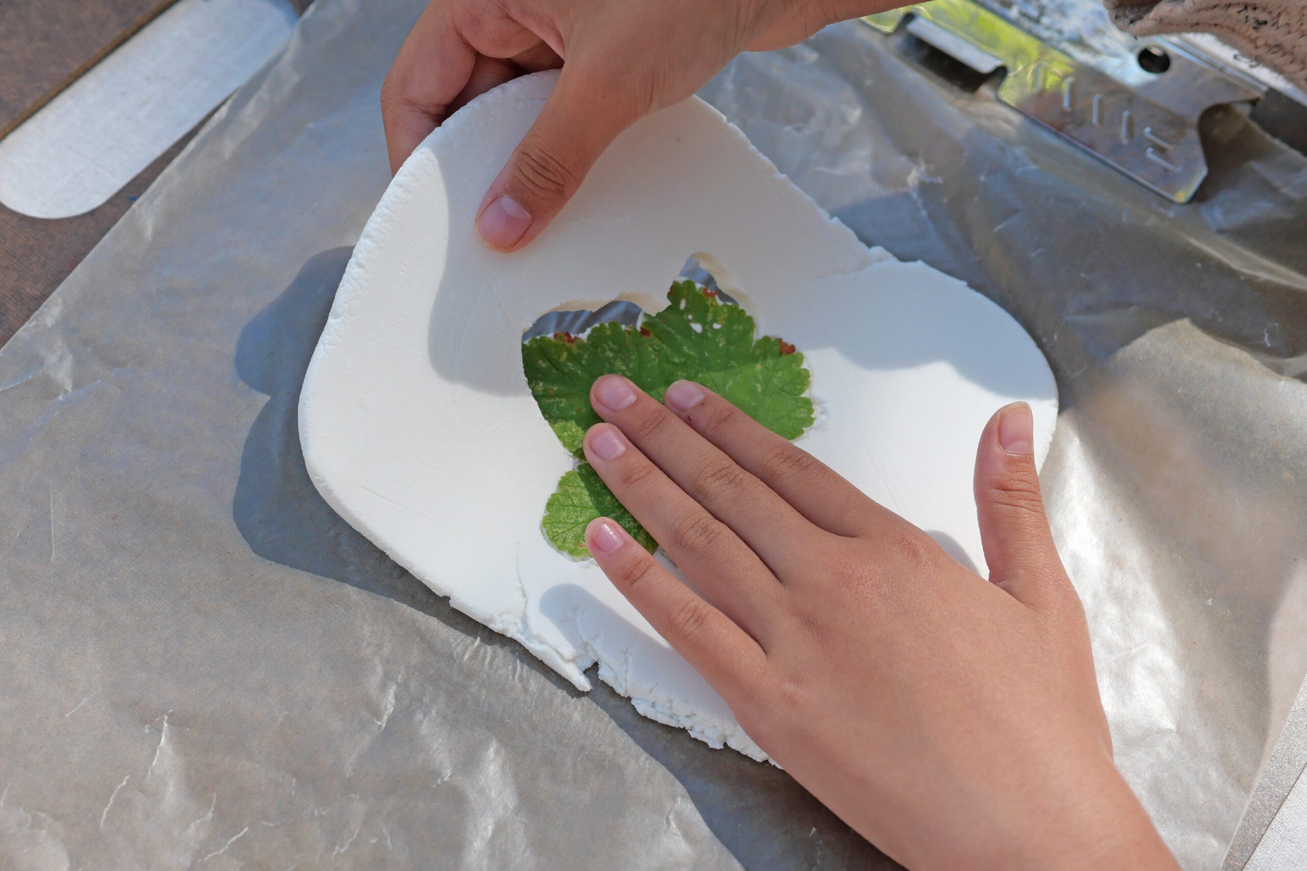Place the textured underside of the leaf against the clay. Press the entire leaf firmly into the clay with your hand. Taking care not to shift the leaf, gently press down to ensure the shape and veins are clearly imprinted into the clay.