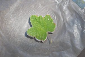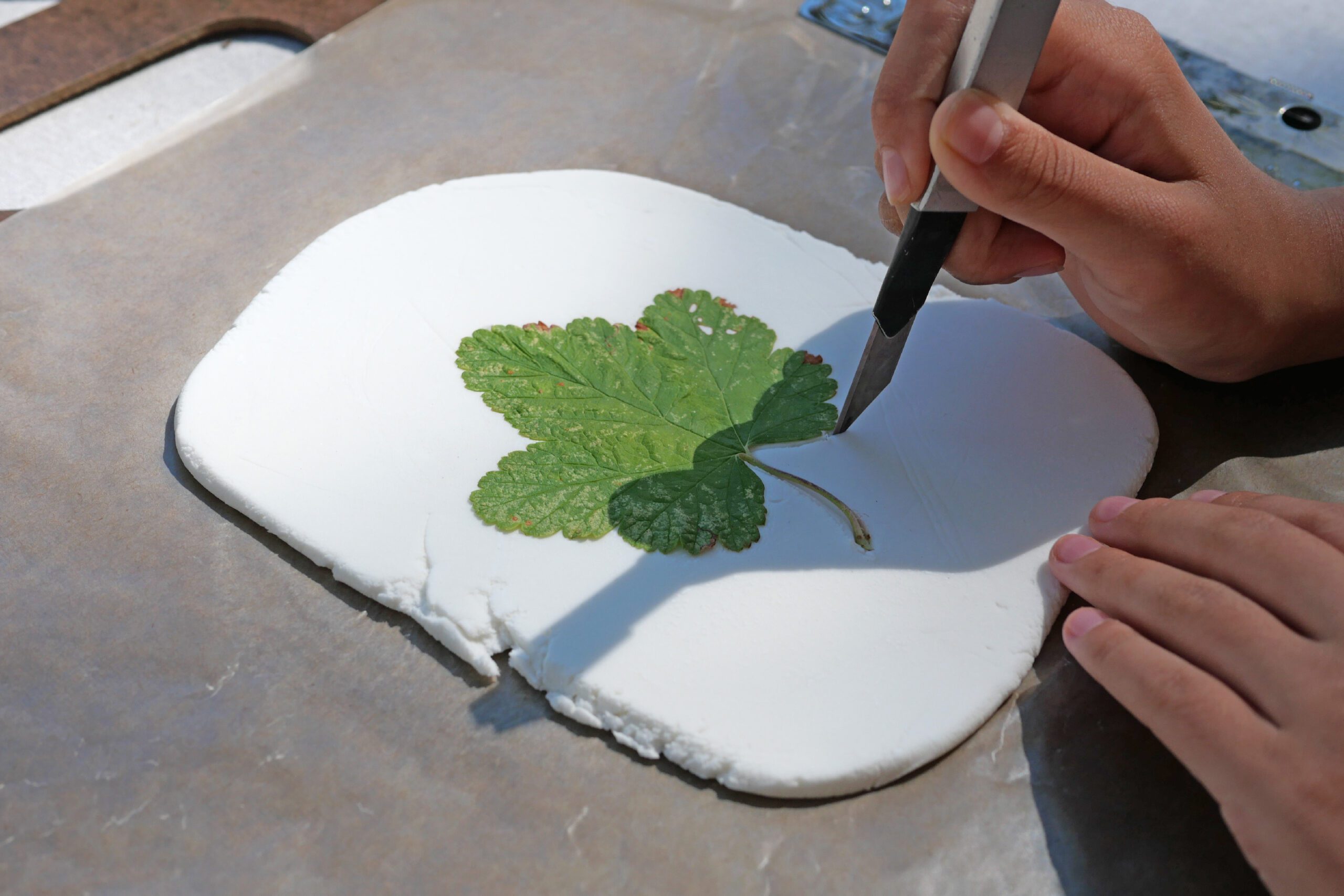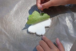 葉脈の凸凹のある裏面を粘土に触れるように置きます。手で葉っぱの全体を粘土に押し付けます。葉っぱがズレないように注意しながら、優しく葉の形と葉脈がしっかりと粘土に写るように押し付けます。