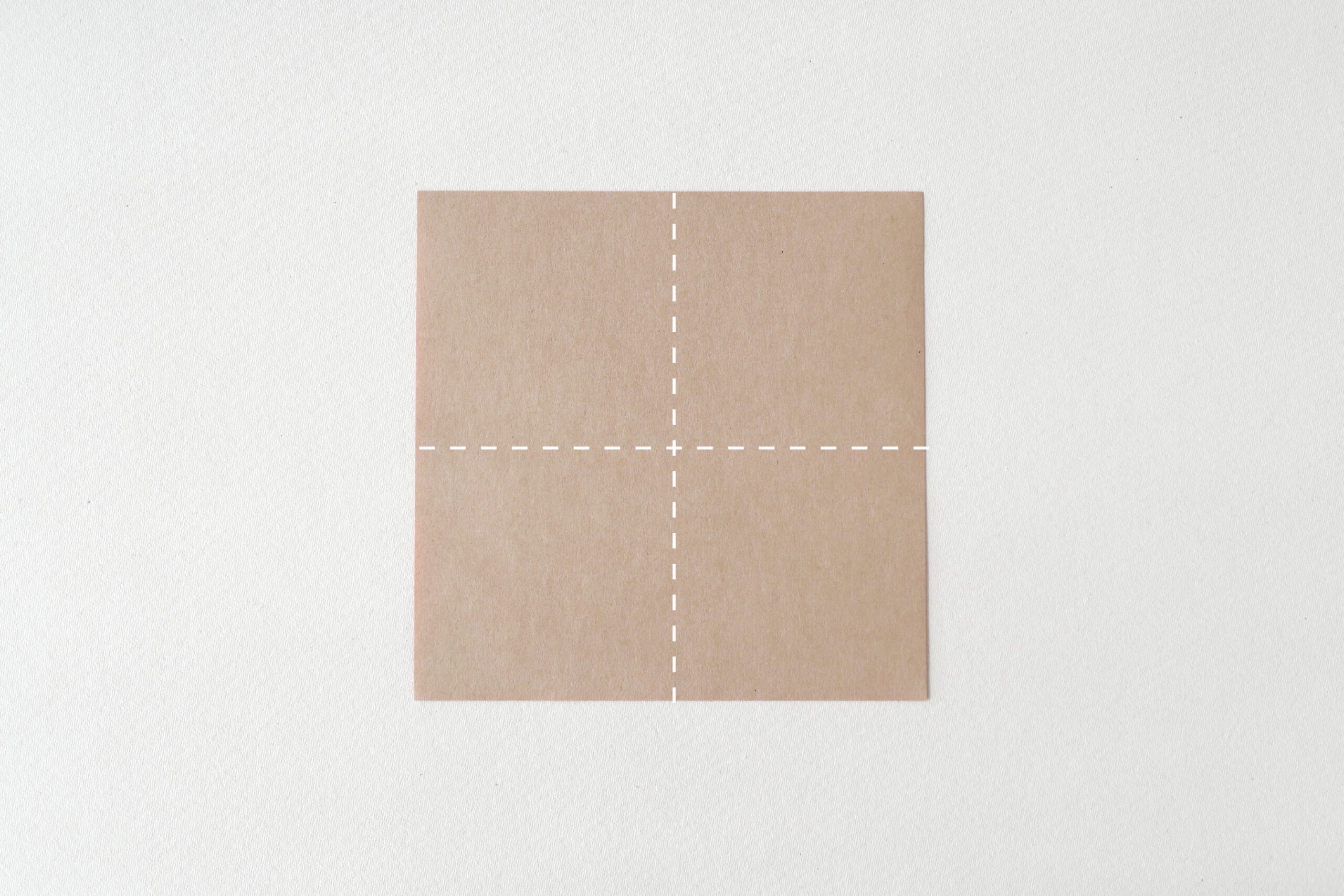 Place the origami paper with the back side facing up, and fold it in half like the dotted line. Open it once, then fold the other side in half again, creating quarter-fold creases both vertically and horizontally.