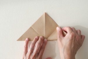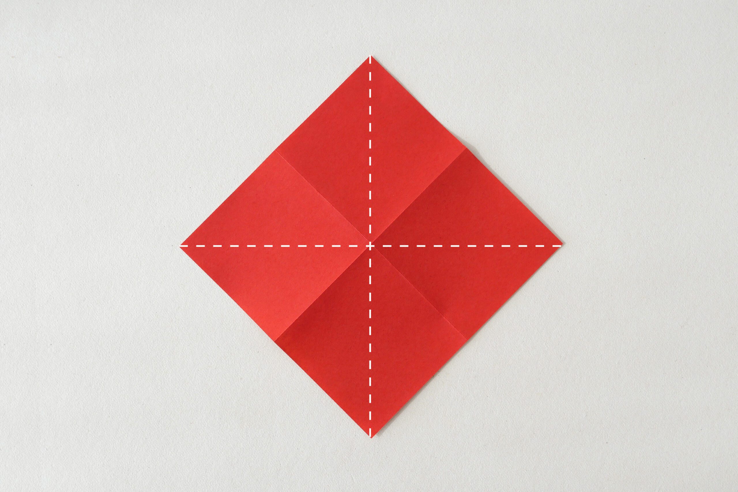 紙を開いて表面に返します。点線のように対角線上に三角に半分に折り筋を2箇所つけます。