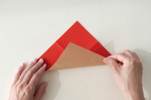 Insert the pointed tip of the other piece of origami paper into the straight section. Once all sides are inserted, your origami diamond is complete. It stays securely in place without glue, held fast by the friction between the papers, so it won’t come apart easily.