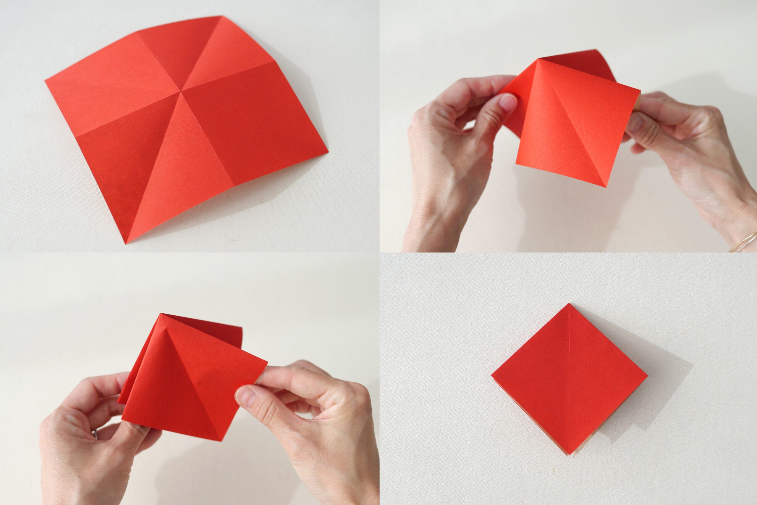 点線のように、四角の中心線に合わせて両側を三角に折り、内側を開いて潰すように折ります。裏側も含めて、全部で4箇所それぞれ同じように折ります。これでひとつ目のパーツが完成です。