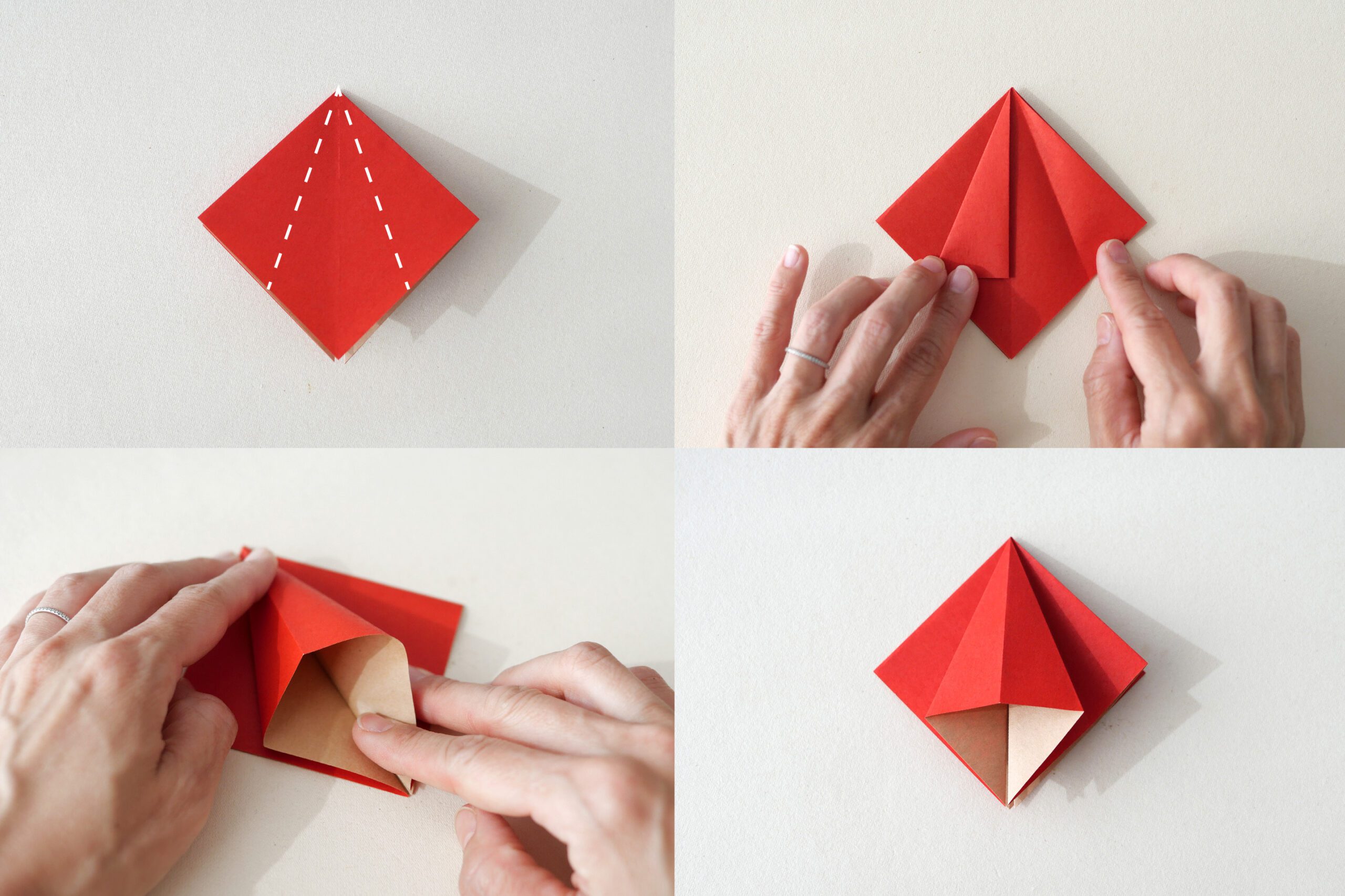 Fold both sides into triangles along the center line of the square, as shown by the dotted line, then open the inside and fold it down to flatten it. Fold all four corners in the same way, including the back side. This completes the first piece.