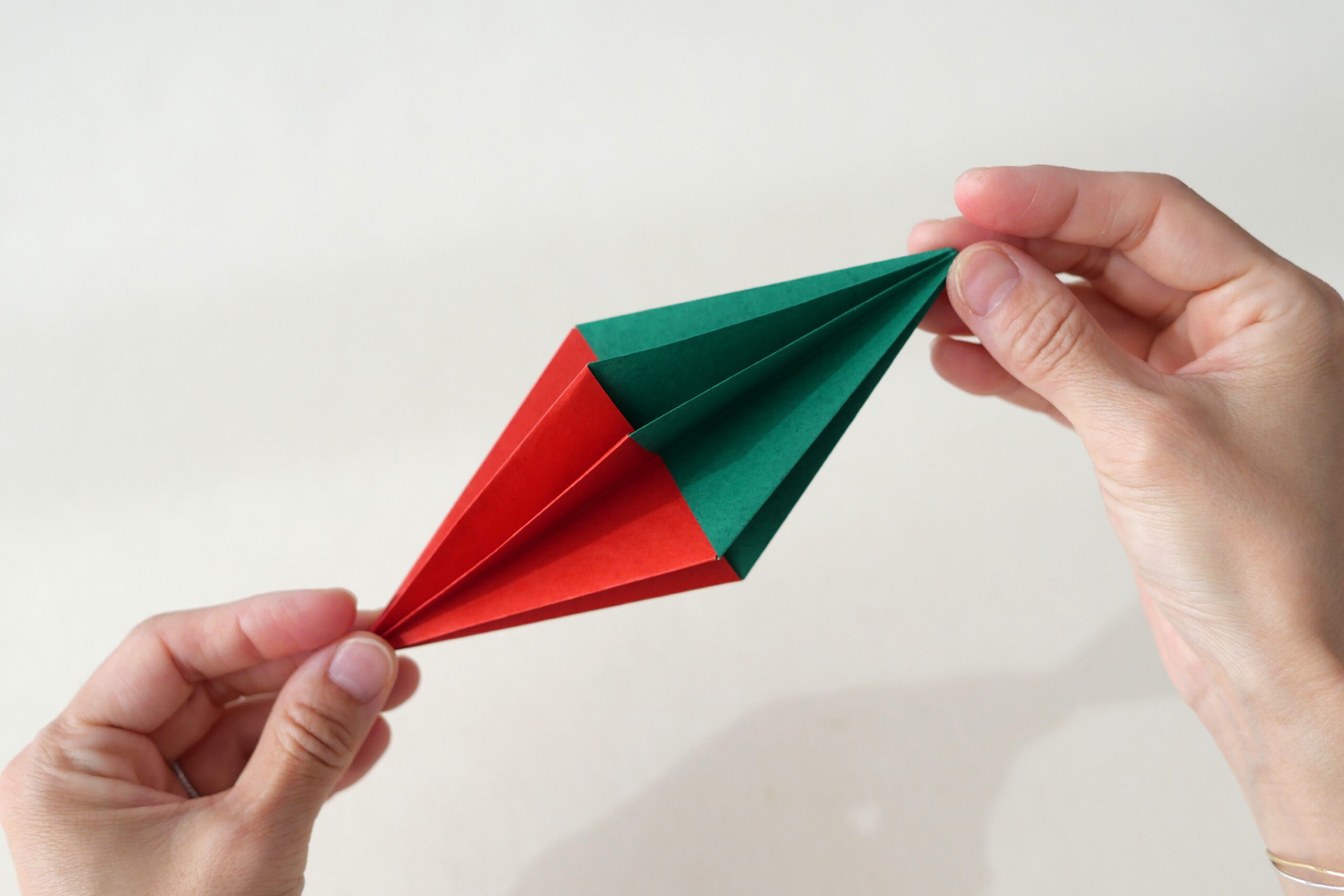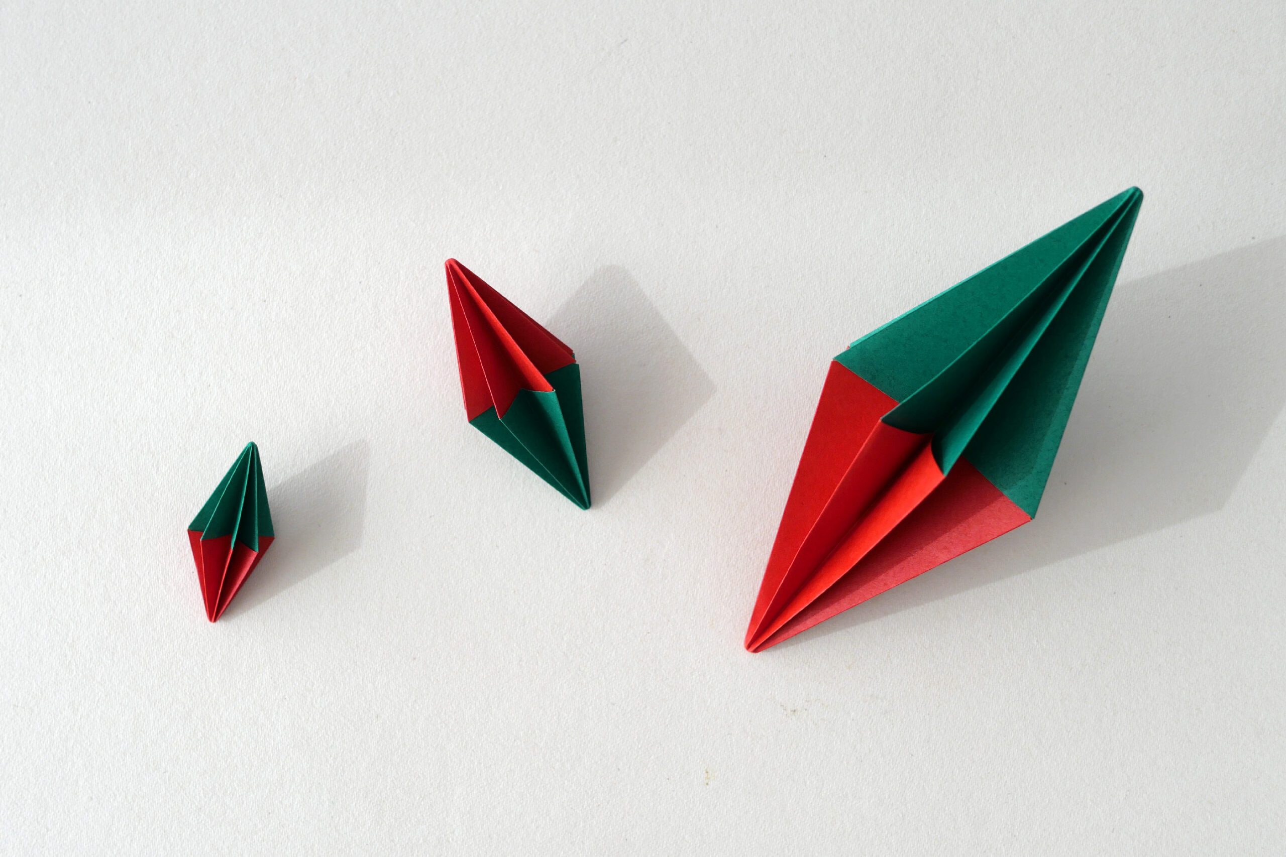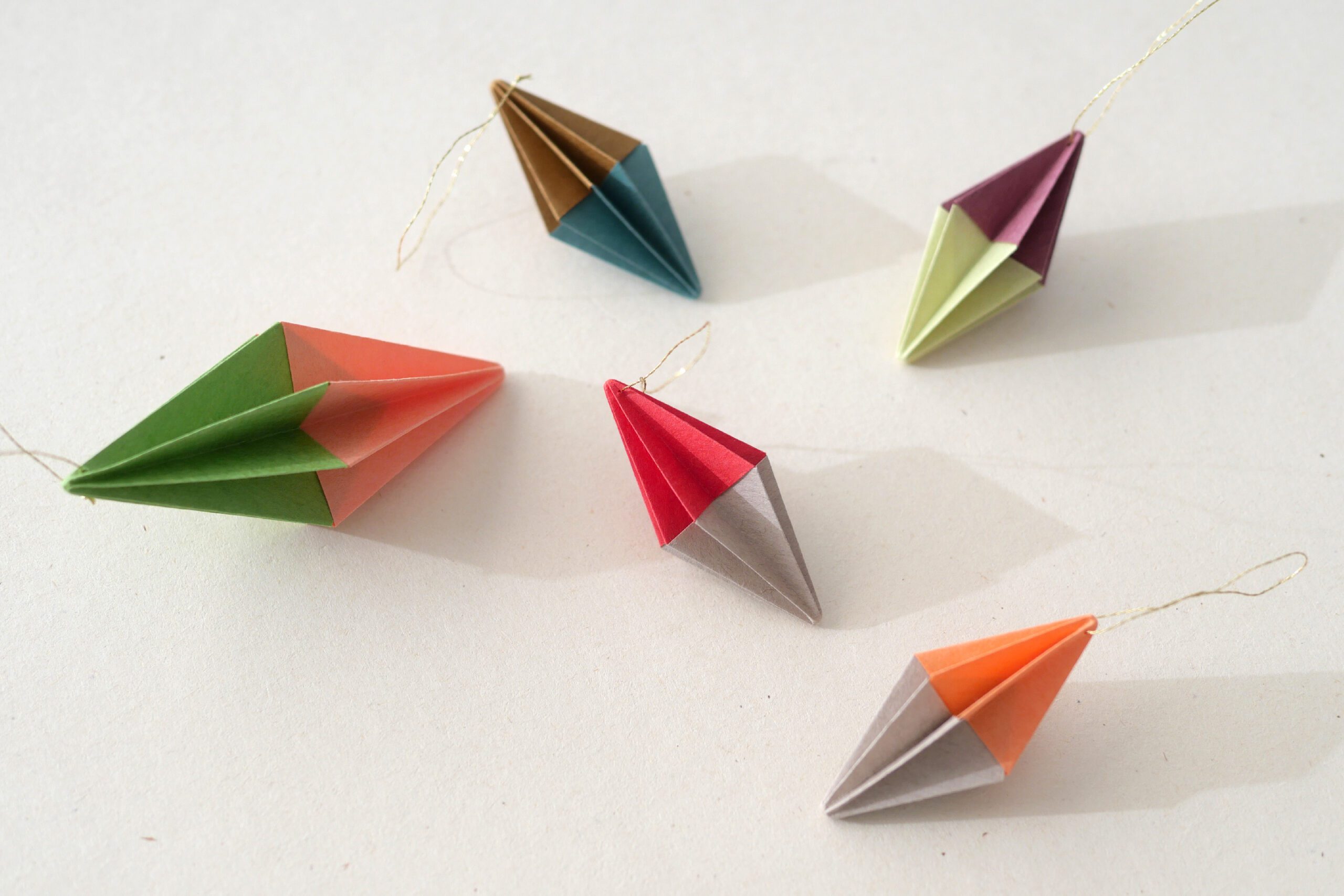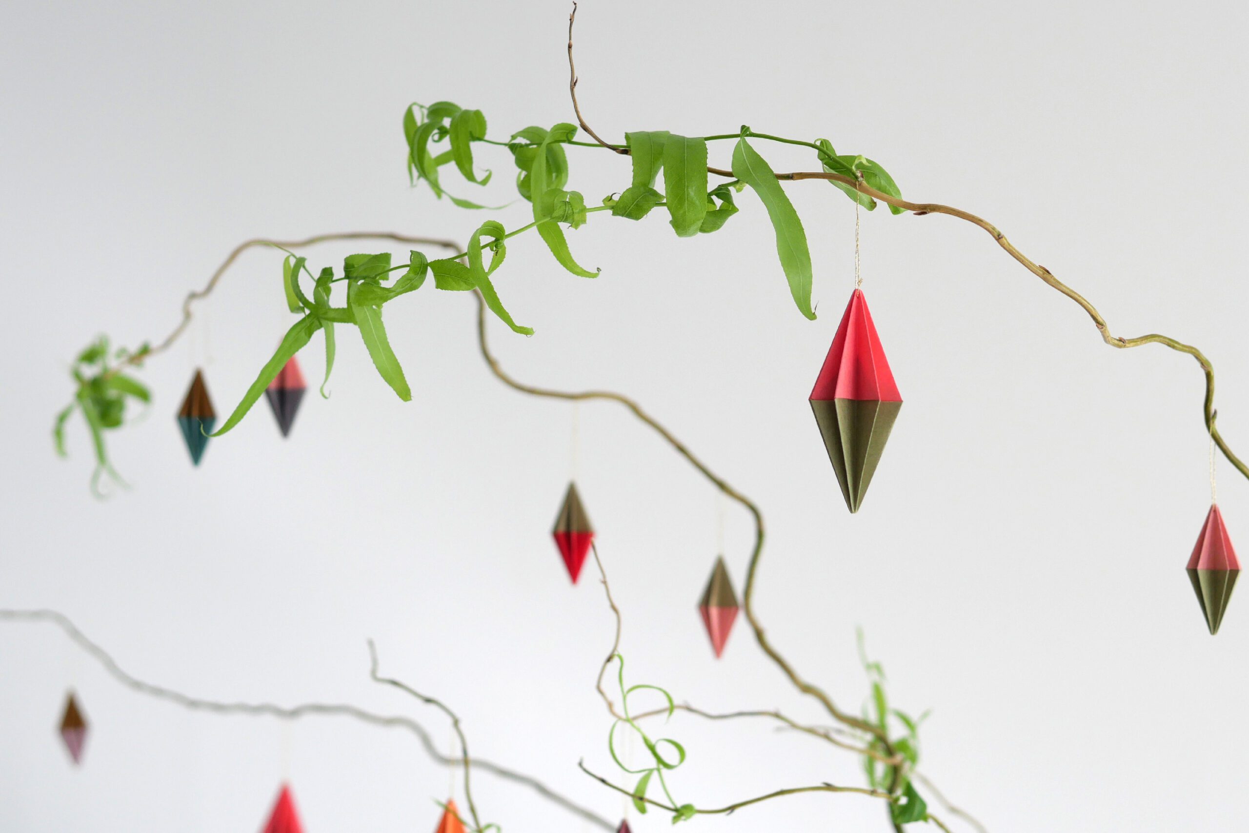 ちょうど折り紙でダイアモンド型のオプジェクトを試作していて、オーナメントにぴったりかもと考えていたのです。まずは赤と緑のクリスマスカラーで。そして、いろいろな色紙を組み合わせて、カラフルなダイアモンドをつくりました。たった2枚の紙からこんなに美しい造形が生まれるなんて、折り紙ってすごい!と改めて日本文化の素晴らしさを感じたのでした。