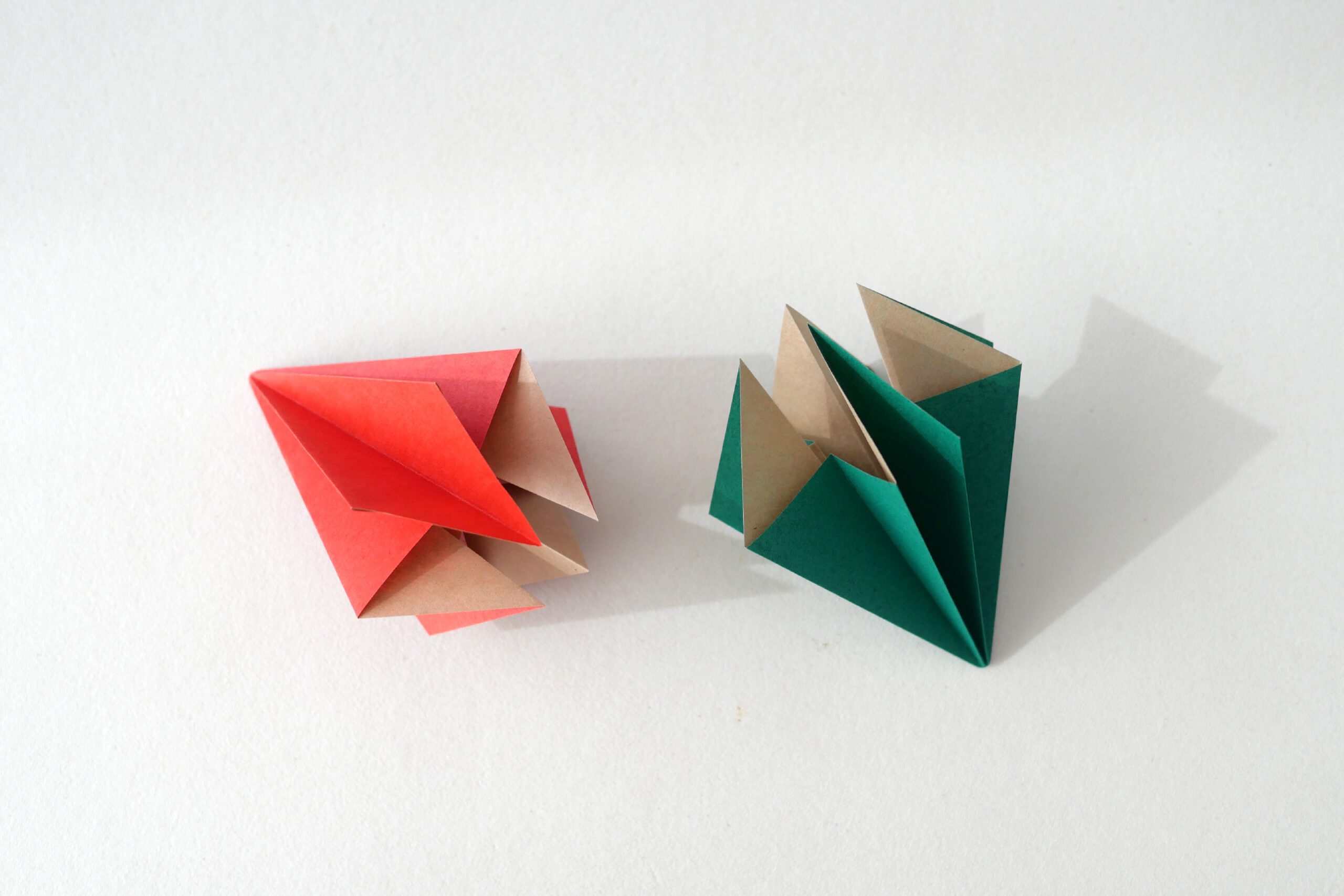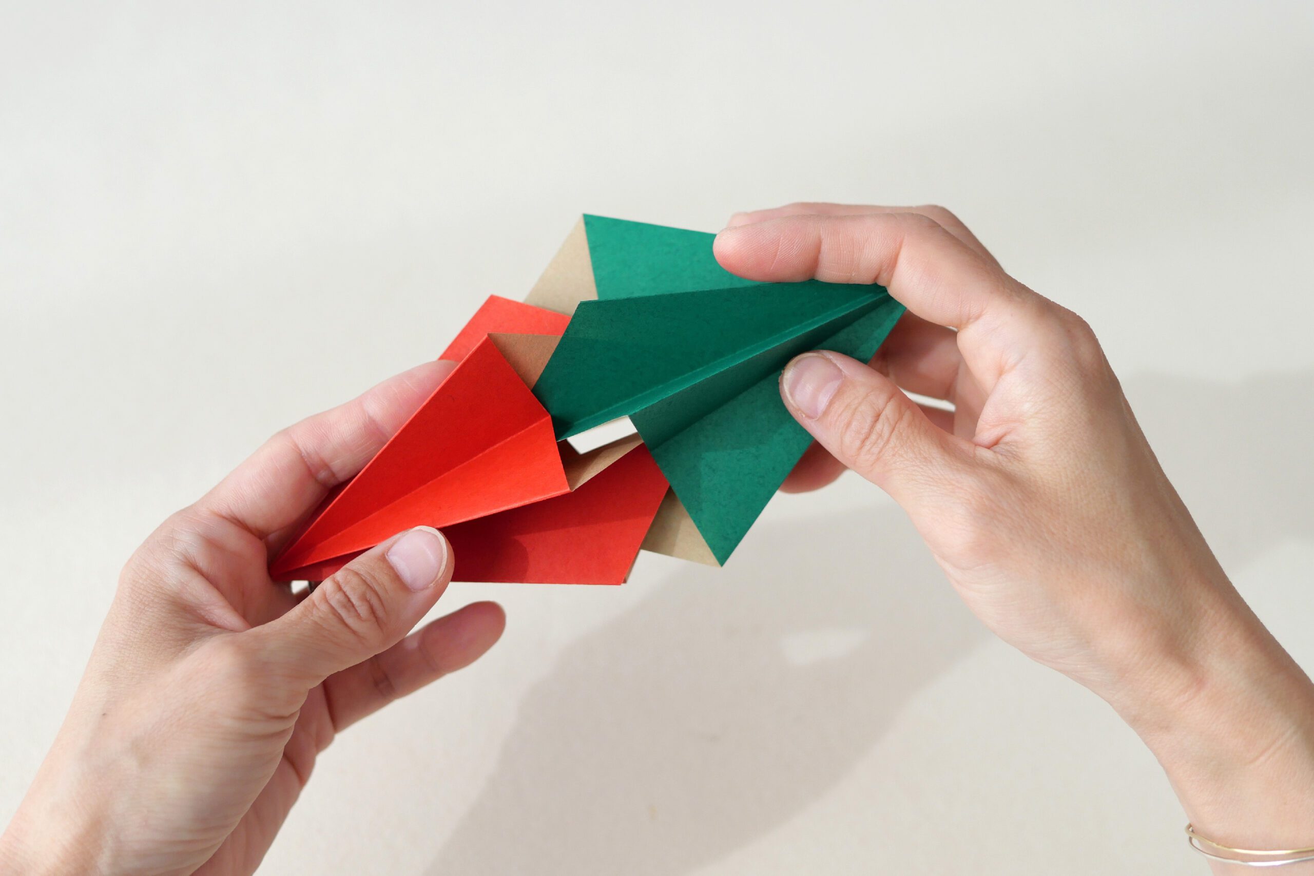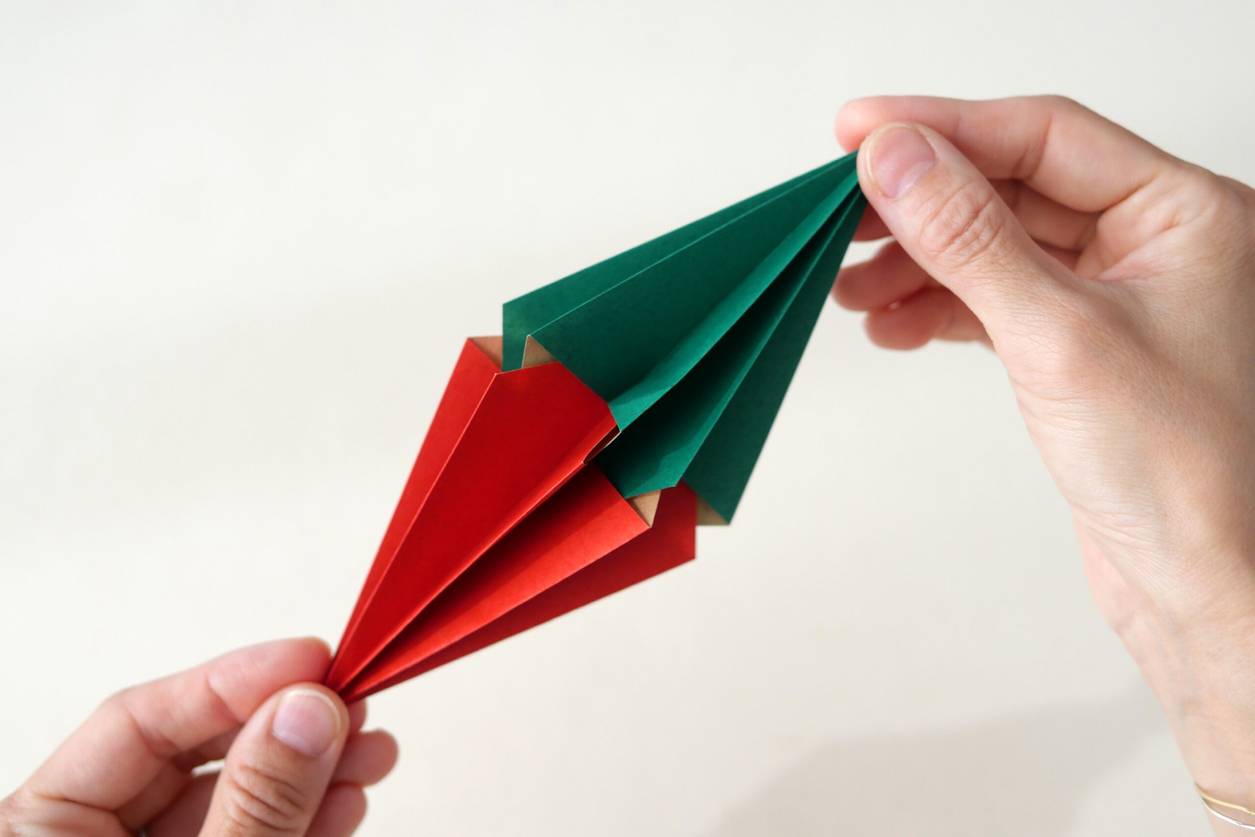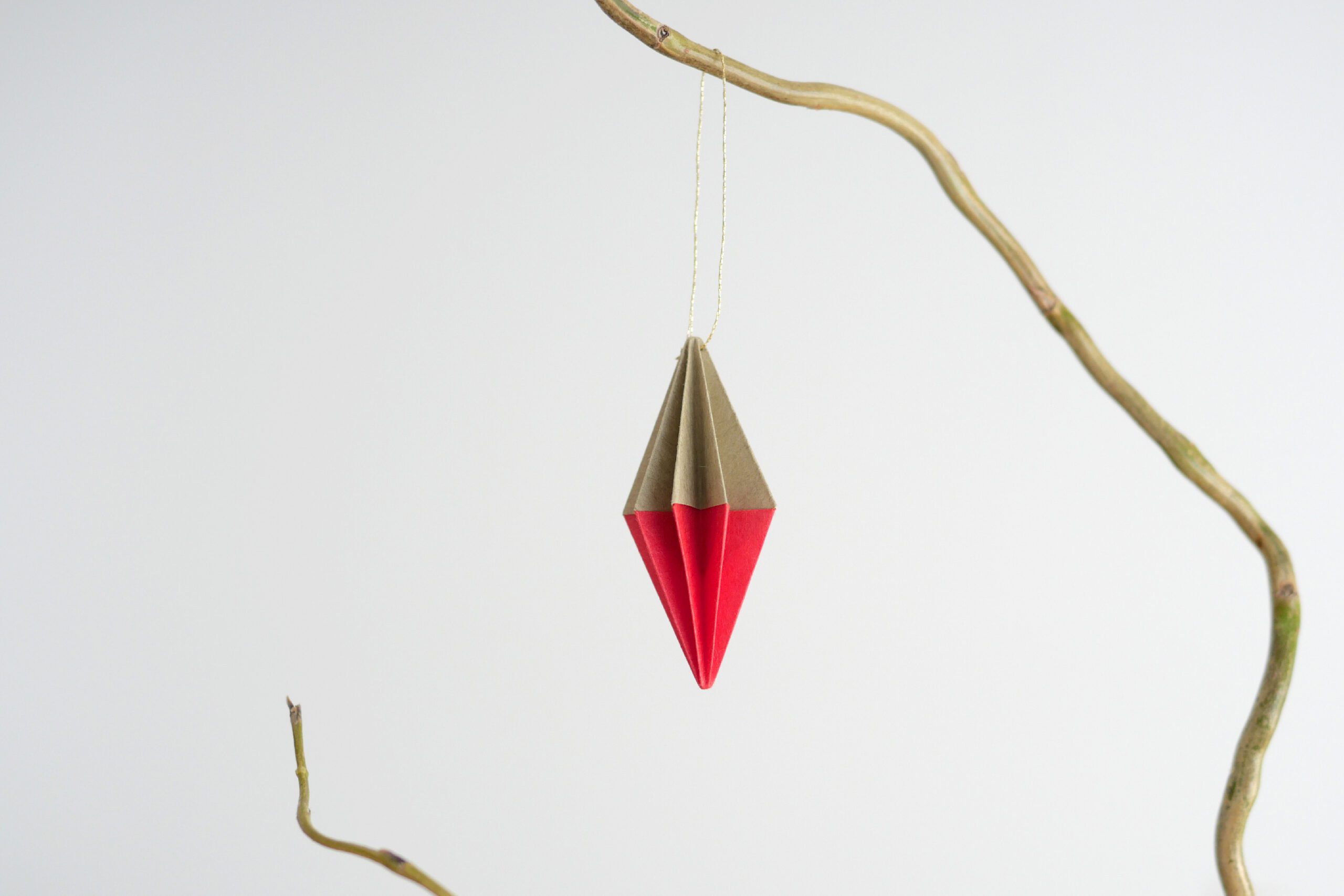 ちょうど折り紙でダイアモンド型のオプジェクトを試作していて、オーナメントにぴったりかもと考えていたのです。まずは赤と緑のクリスマスカラーで。そして、いろいろな色紙を組み合わせて、カラフルなダイアモンドをつくりました。たった2枚の紙からこんなに美しい造形が生まれるなんて、折り紙ってすごい!と改めて日本文化の素晴らしさを感じたのでした。