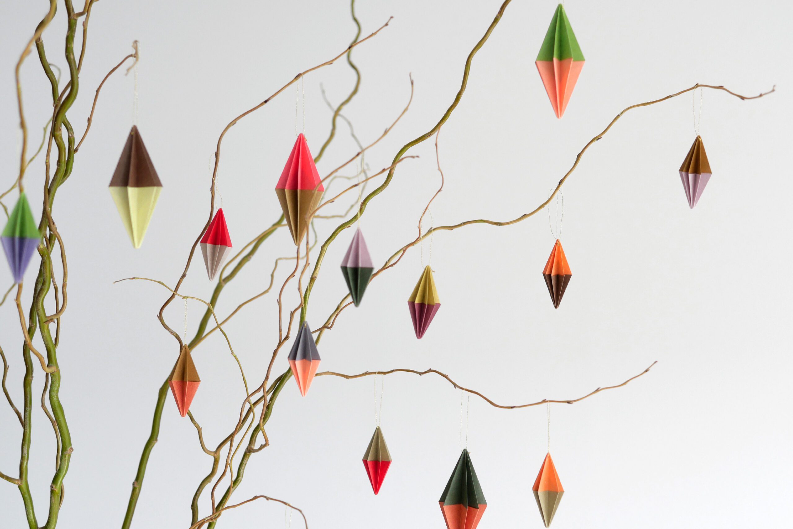 細く長いウィローの枝に映えるシンプルでカラフルなオーナメント。たったの2枚の紙でつくるエコフレンドリーな装飾です。
