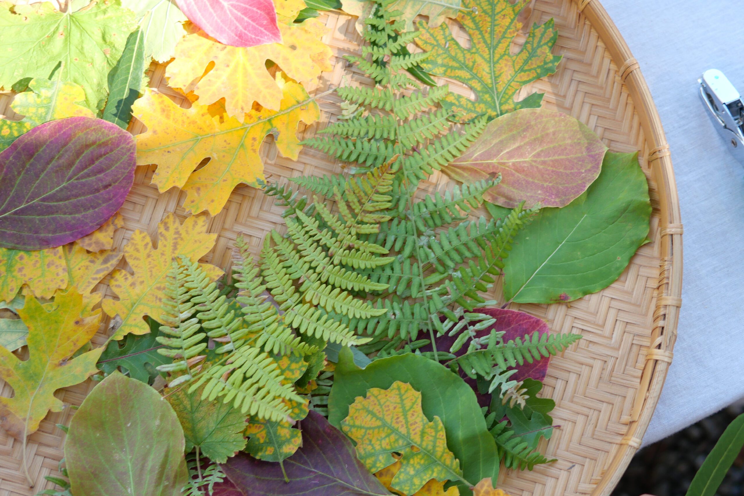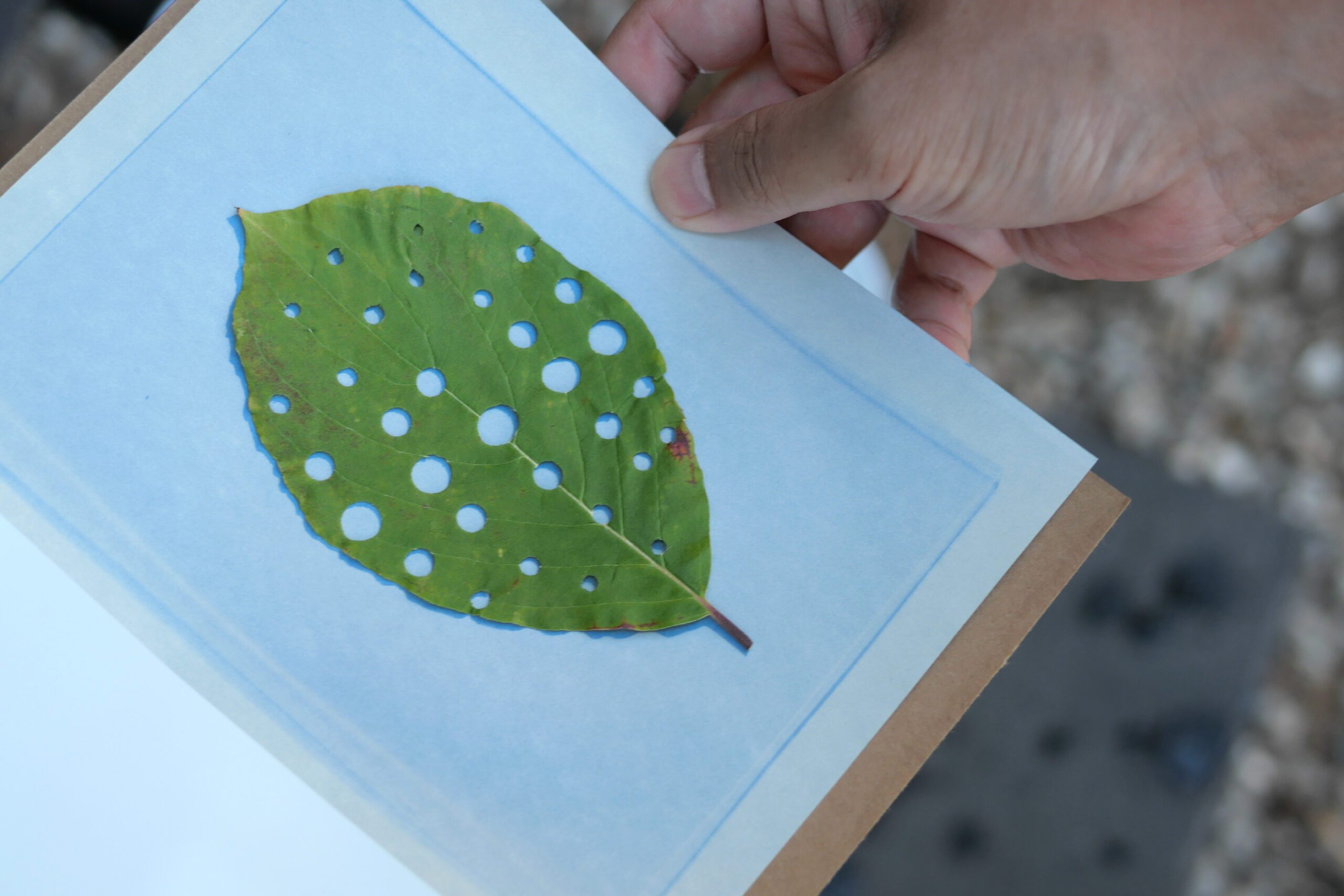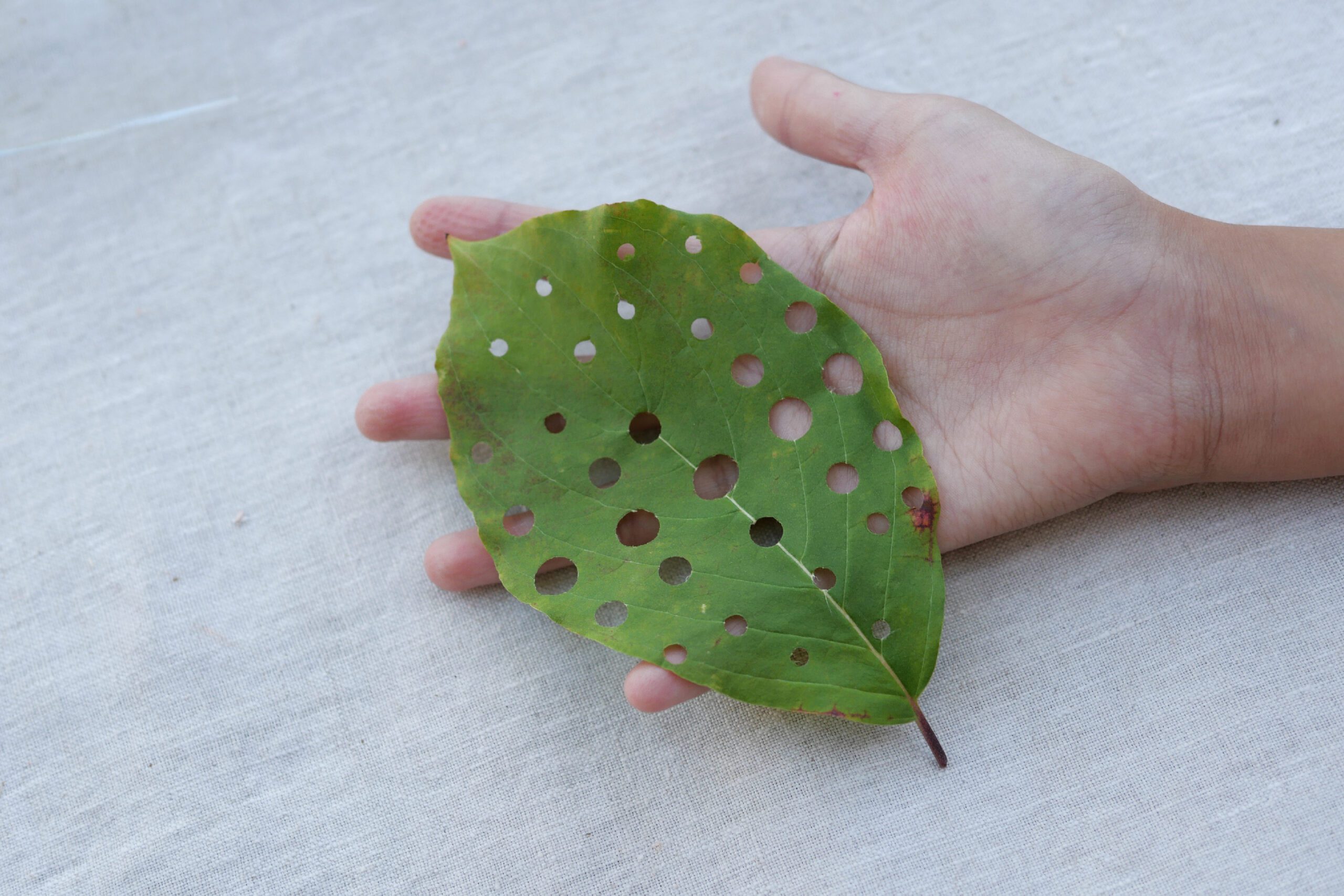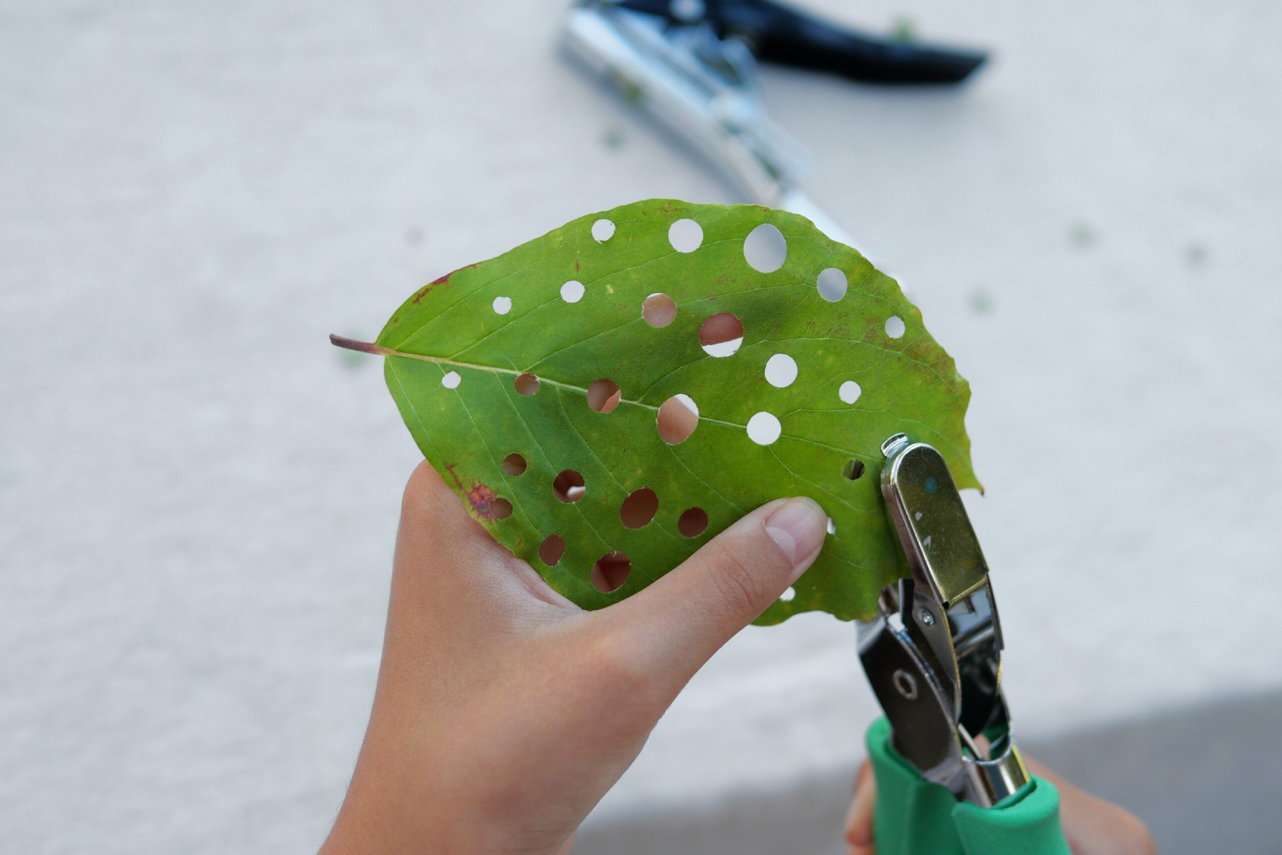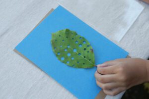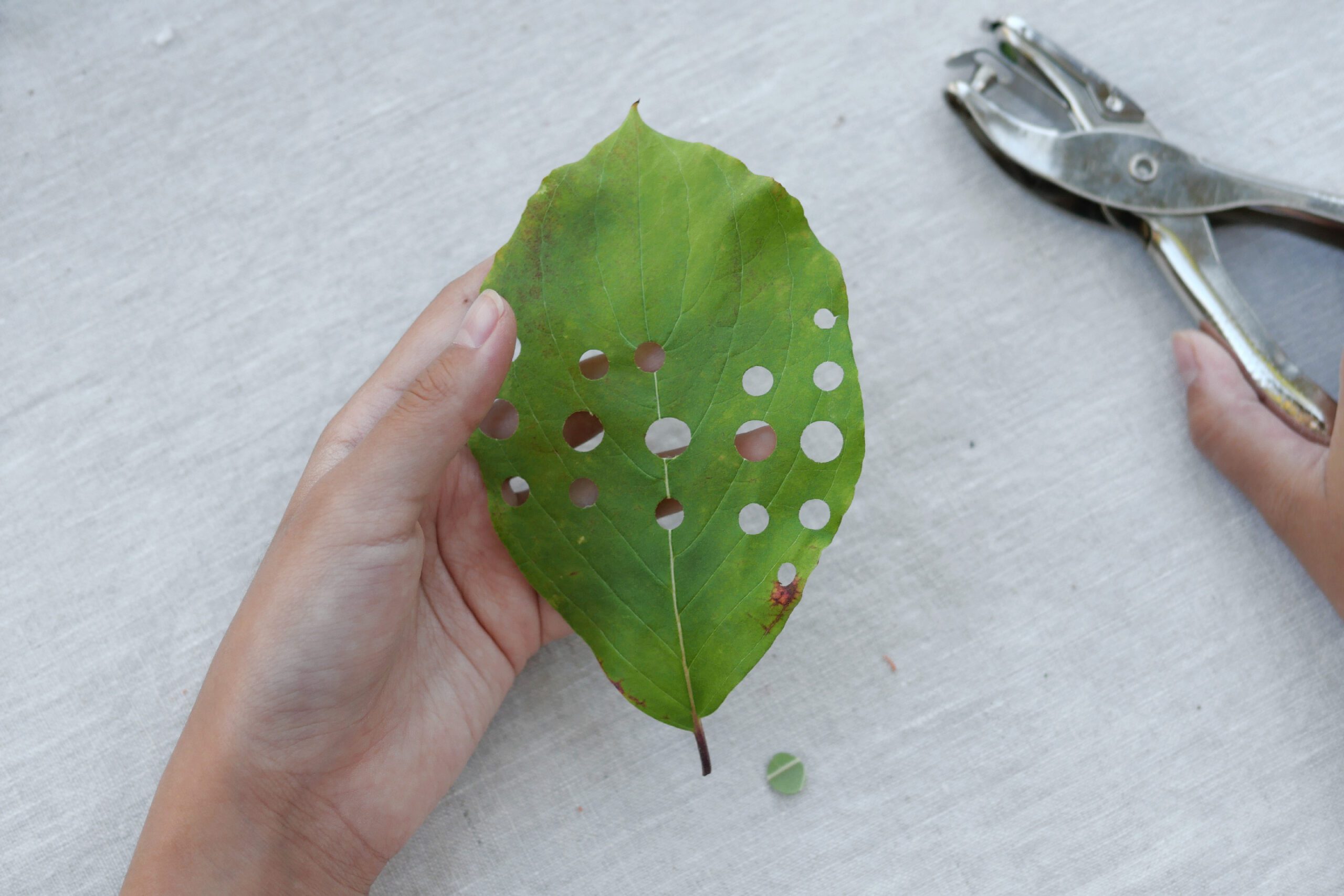 葉っぱにハンチで穴を開ける。虫食いの自然な穴とは違う、機械的な穴が葉っぱの上に並んでいます。きっと葉っぱも驚いていることでしょう!
