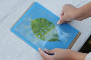 台紙の上にサンプリントペーパーを置き、その上に葉っぱを配置します。そして上からアクリル板で押さえます。そして、たっぷりの太陽の光が当たる場所へ置きます。青い紙が白く色褪せるまで数分間置いておきます。