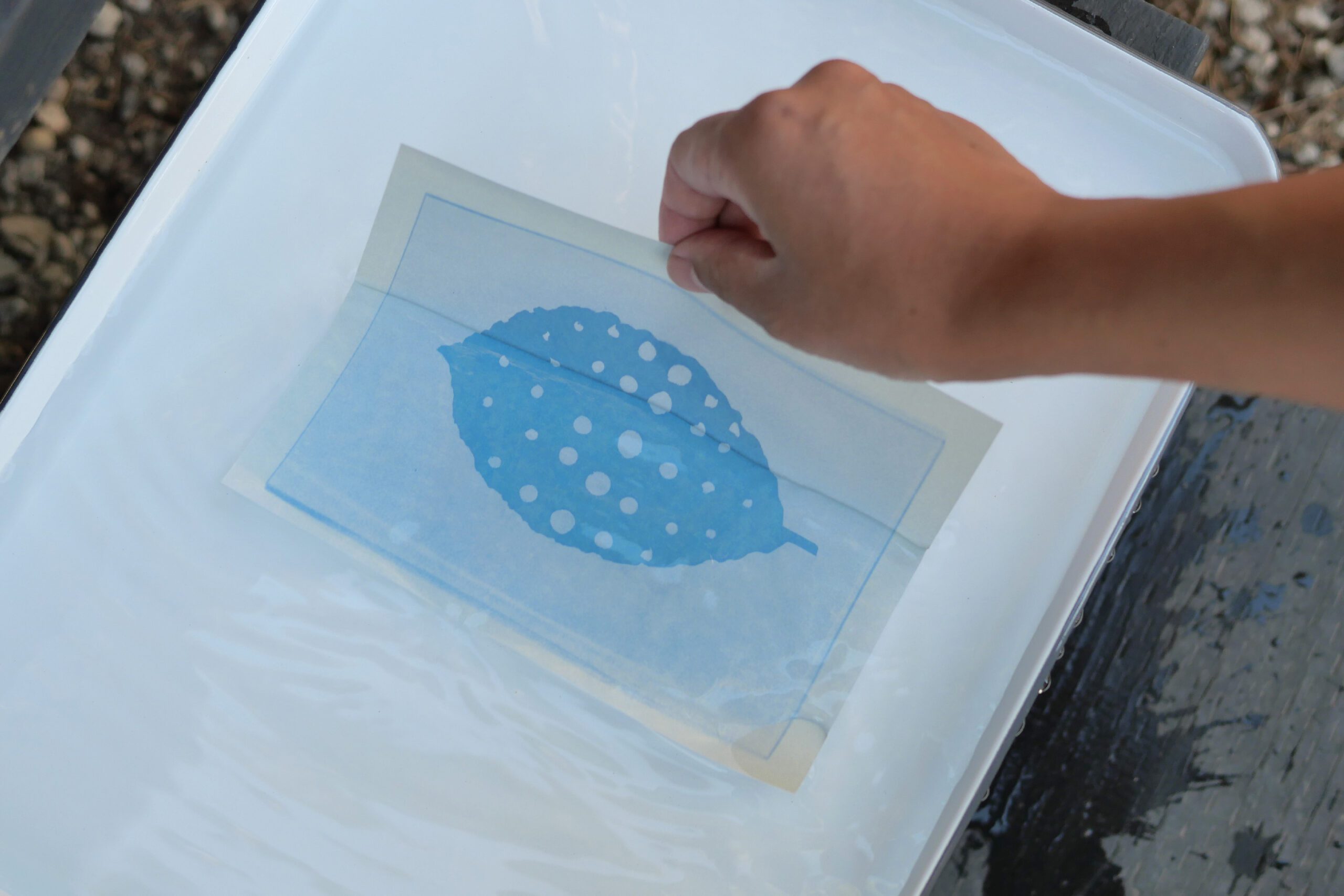 十分に太陽の光を浴びたらオブジェクトを取り除いて、水を張ったバットに1~2分ほど浸けておきます。