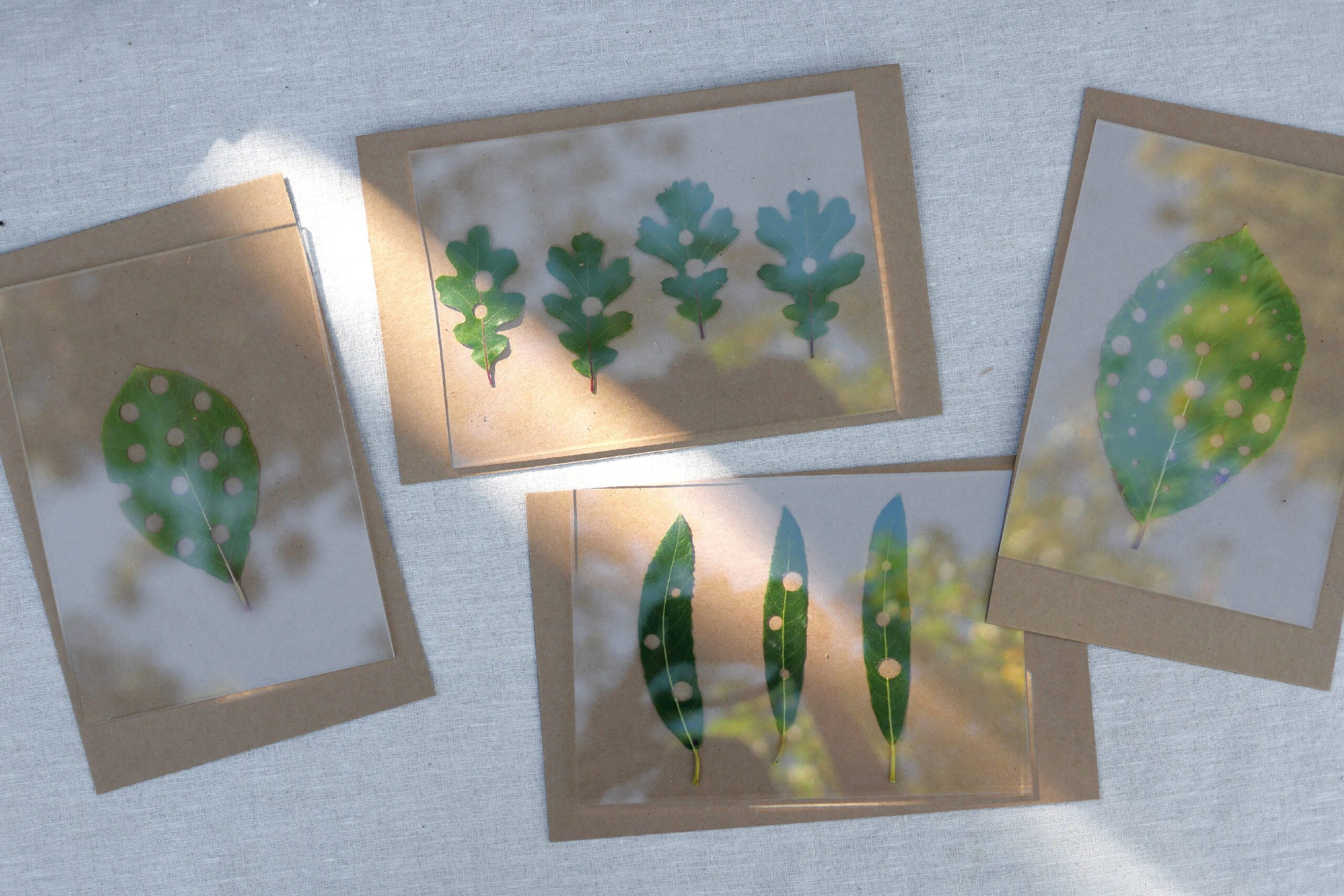 今回娘が面白いことをしていたので記録に残すことにしました。彼女はオブジェクトとなる葉っぱにパンチで穴を開けたのです。小さな穴はそのまま光を通し、紙にしっかりとその形を残します。自然の葉っぱの形に、人工的な丸い穴。その対比に不思議な魅力を感じたのです。
